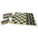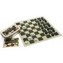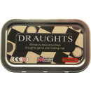 Pocket sized travel draughts game in tin with folding mat, pieces and illustrated instruction booklet. Tin size: 97mm x 59mm x 23mm