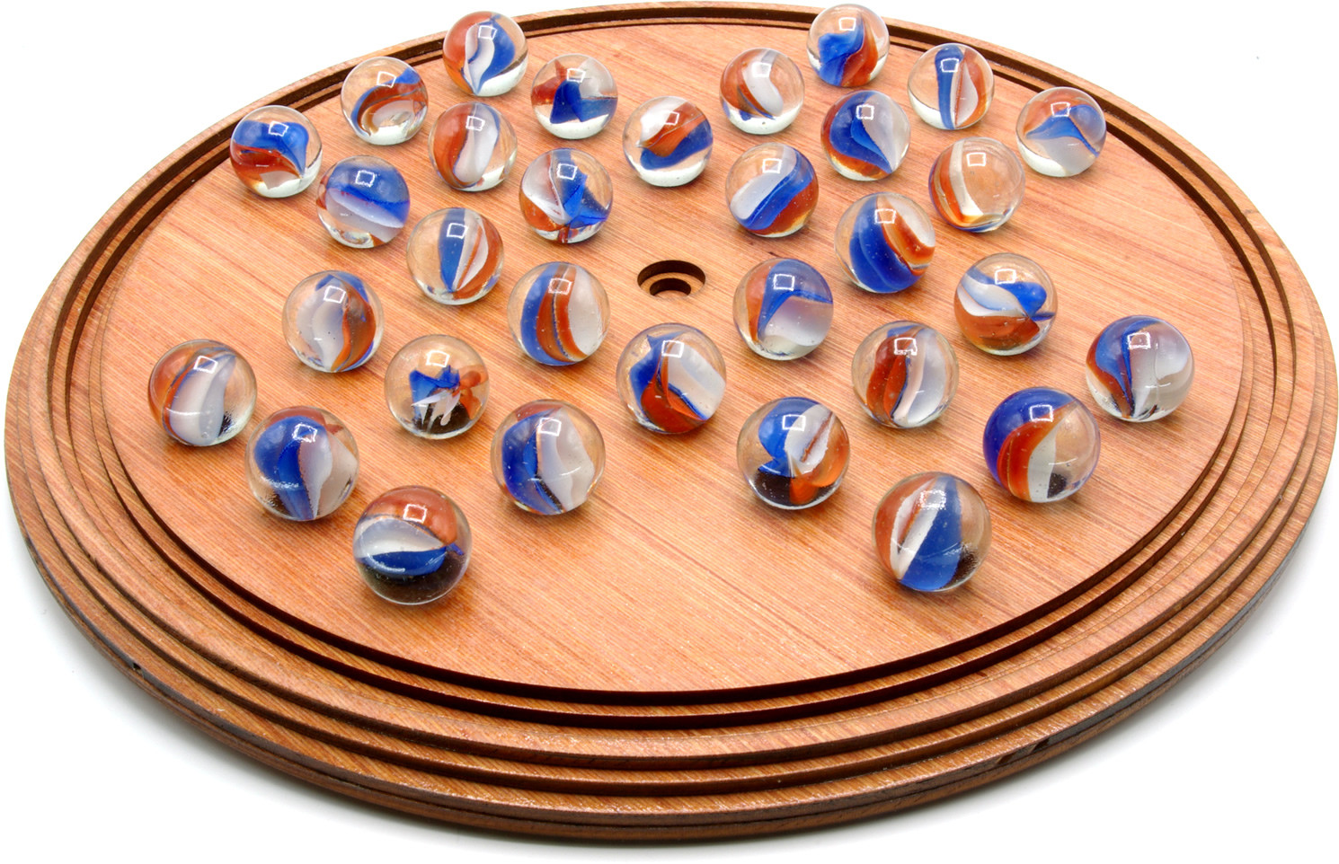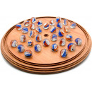 Solid hardwood Board size: 30 x 30 x 2cm. Hand made in the UK Traditional 1-player game, wooden construction with glass marble playing pieces. 30cm diameter board with 20mm playing marbles. Made in the UK from FSC certified sustainable timber.